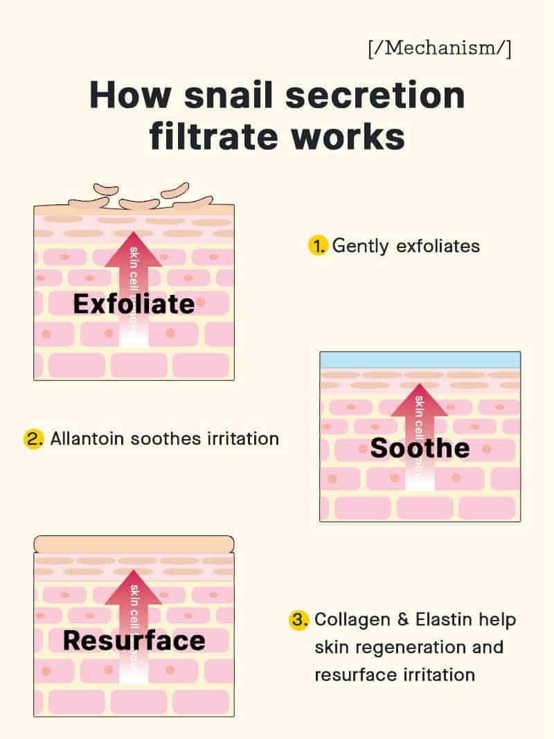 - Mucina de melc (96%) repară pielea deteriorată, îmbunătățește textura și reduce pigmentarea și liniile fine.