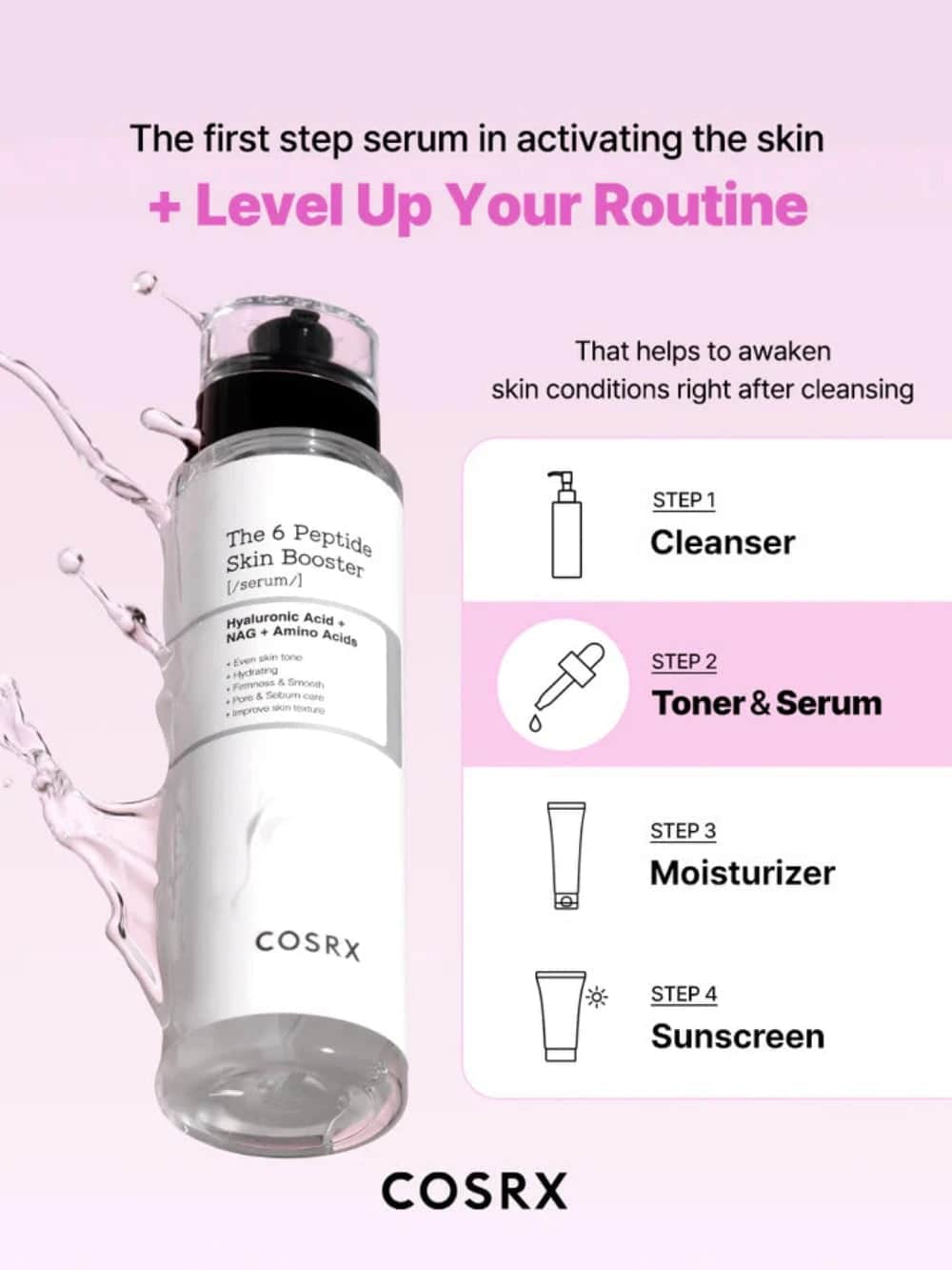 Unul dintre cele mai populare produse noi de la COSRX, The 6 Peptide Skin Booster este un ser facial multifuncțional, creat pentru a îmbunătăți fermitatea pielii, a reduce semnele îmbătrânirii și a uniformiza tonul pielii.