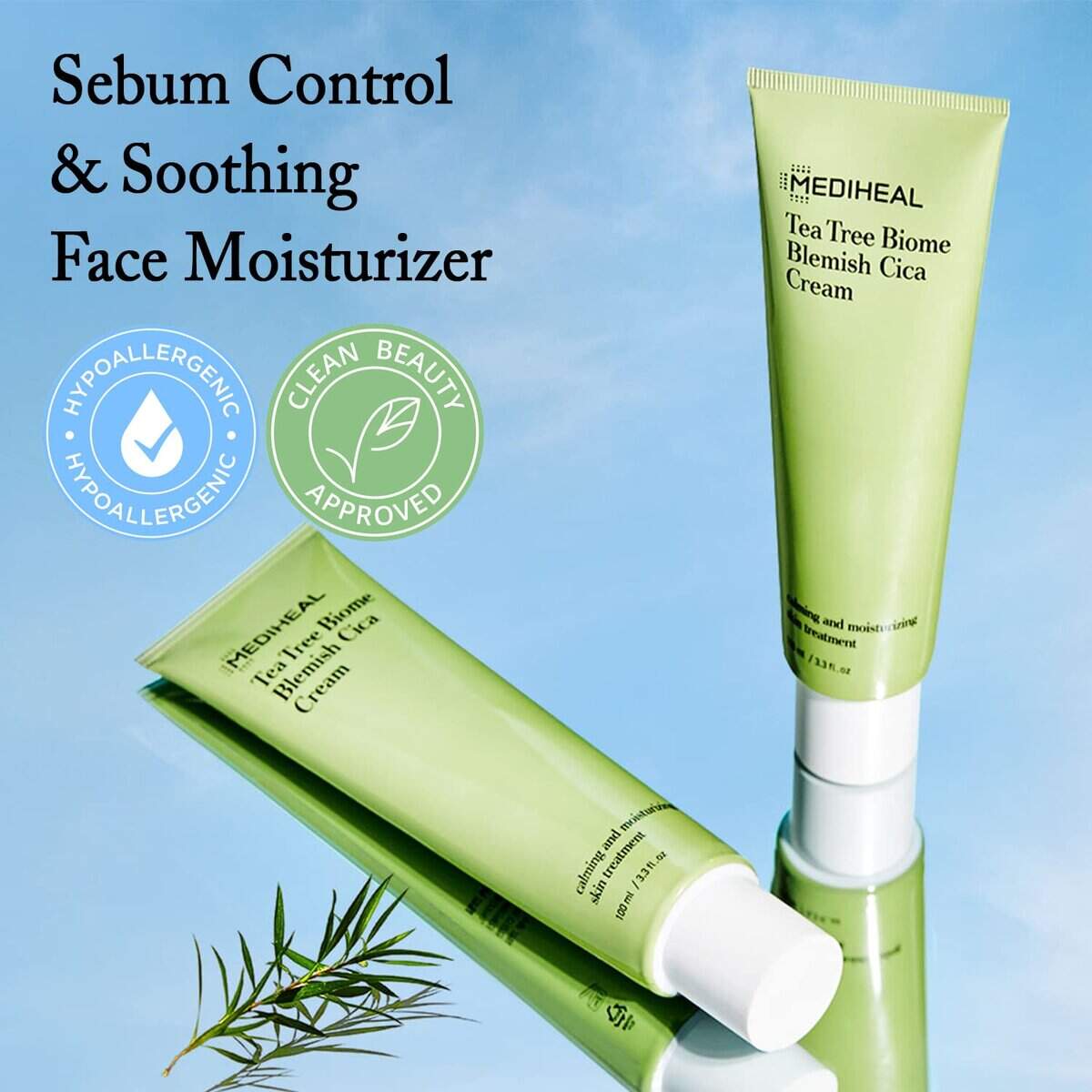 Mediheal Tea Tree Biome Blemish Cream hidratează, controlează sebumul și calmează pielea sensibilă cu extract de arbore de ceai, centella și aloe vera.