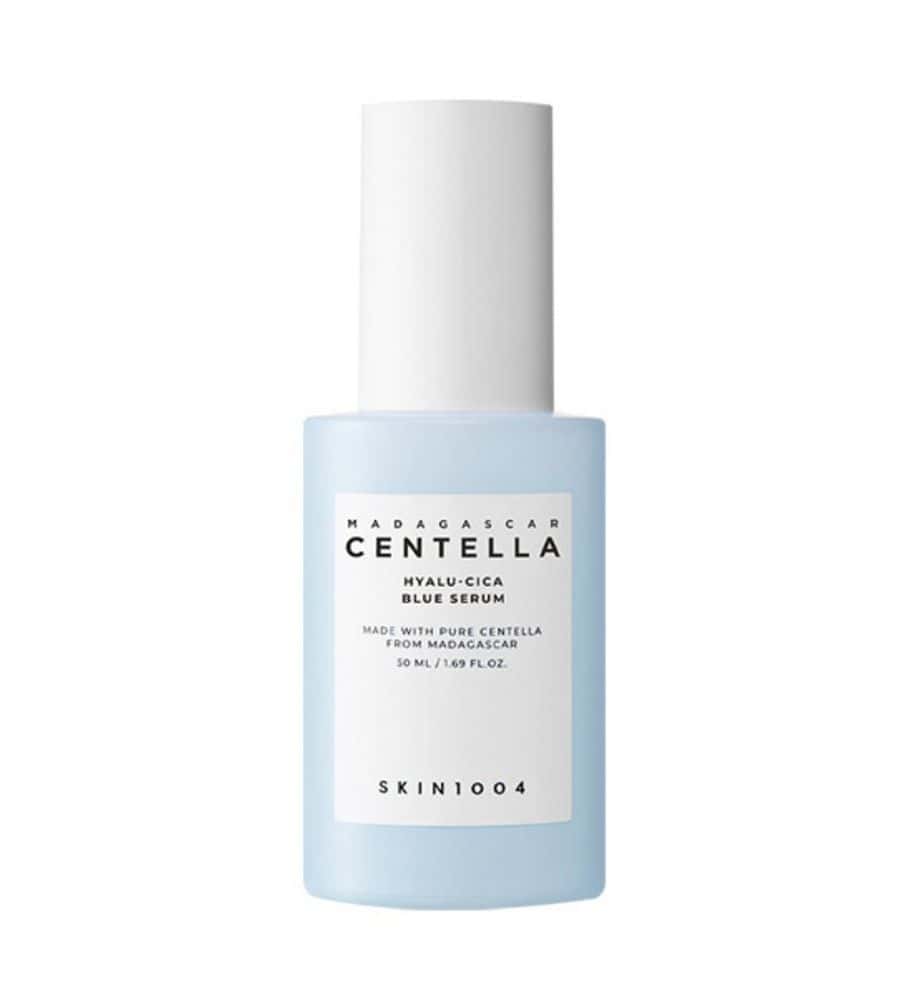 SKIN1004 Madagascar Centella Hyalu-Cica Blue Serum calmează și iluminează pielea, oferind hidratare multi-stratificată cu 5 tipuri de acid hialuronic și extract de Centella Asiatica.